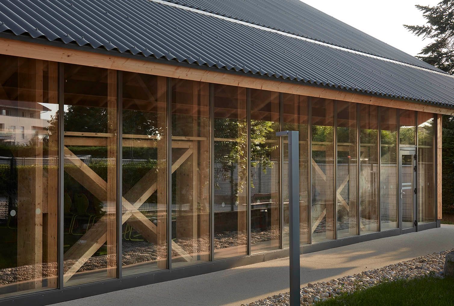 La façade pignon sur rue, zone dédiée à la cuisine est en béton brut finement sablé. L'espace de restauration laisse quant à lui la part belle au bois (structure, façade et habillage intérieur) pour offrir le plus grand confort aux usagers.