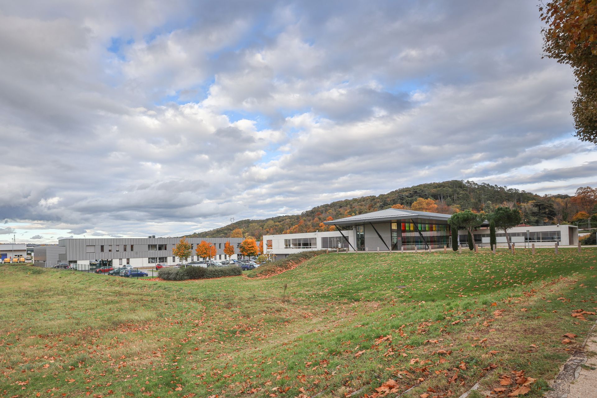 Les aménagements extérieurs d’une surface de 900 m2 comprennent un parking paysager de 60 places, un parvis d’entrée, un patio intérieur, et une cour des services techniques équipée de cases à granulats.